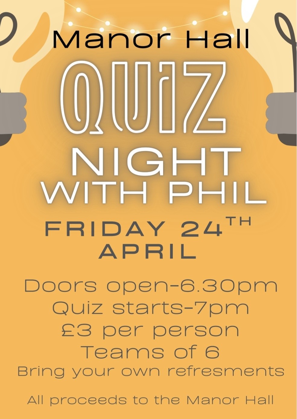 Join us at Phil's Quiz Night in the Manor Hall for an enjoyable and competitive night of trivia.